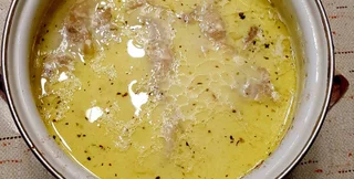 Дальше наступает фаза приготовления непосредственно того, что в Черновцах называют "Птичьим молоком". Плавленый сыр предварительно подмораживаем, затем измельчаем и добавляем в бульон. Как следует перемешиваем, доводим до кипения, сдабриваем итальянскими травами и солью. Добавляем мелко нарубленный чеснок. Идея в чем? В том, чтобы сыр полностью растворился и образовал с бульоном одну массу нежнейшего молочного цвета. Когда это происходит, убираем огонь и оставляем смесь в покое минут на 10-15 при закрытой крышке.