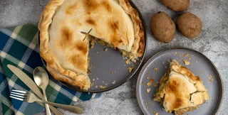 Тесто для этого пирога готовится без яиц и дрожжей, а в фарш добавляют немного сырого картофеля.