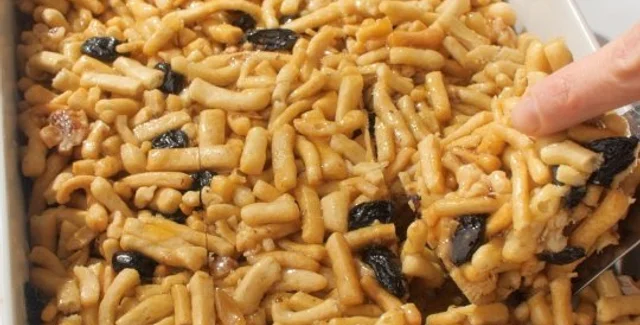 К жареной лапше можно по желанию добавить грецкие орехи и изюм, залить горячим сиропом, быстро перемешать, пока сироп не остыл, и выложить в форму, разровняв и утрамбовав чак-чак смоченными в воде руками. Дать десерту застыть 2-3 часа, а при подаче порезать на порционные кусочки.