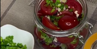 Взять чистую банку, выложить в нее слоями лук, затем черри, далее чеснок, сверху – зеленый лук или зелень. Все залить соусом. Для него смешать в отдельной миске растительное масло, базилик, перец, соль, сок лимона, мед. Все перемешать и залить в банку. Встряхнуть ее немного, чтобы соус равномерно распределился, и поставить на час в холодильник для пропитки. Вкуснейшая закуска готова.