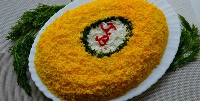 Дальше салат нужно накрыть пищевой пленкой и поставить в холодильник на несколько часов, чтобы он пропитался и настоялся. Перед подачей можно украсить салат желтками, выложив их в виде цветочков или звездочек.