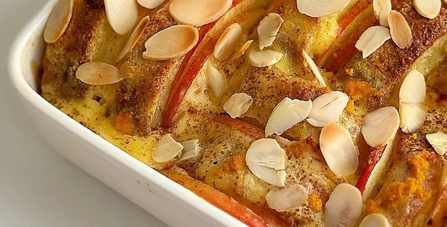 Каждый кусочек кулича окунуть в крем и выложить в форму, перемежая яблоками. Сверху посыпать сахаром, корицей, цедрой апельсина, миндальными хлопьями и добавить сливочное масло. Запекать в разогретой до 200 градусов духовке около 20 минут.