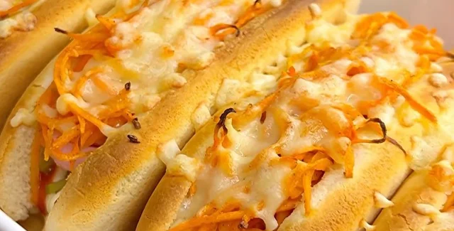 Сложить хот-доги в форму или на противень, посыпать сверху сыром и отправить в духовку, разогретую до 200-220 градусов на 5-7 минут.