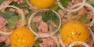 Тортильи или лаваш можно порезать по размеру формы. Выложить первую тортилью (лаваш), посыпать сыром, потом вторую. Далее слоями выложить листья шпината, кольца лука, тунец, разбить аккуратно яйца, добавить масло и специи. Готовить в духовке при 180 градусах 20 минут на режиме верх-низ. Блюдо подойдет для завтрака или перекуса днем.