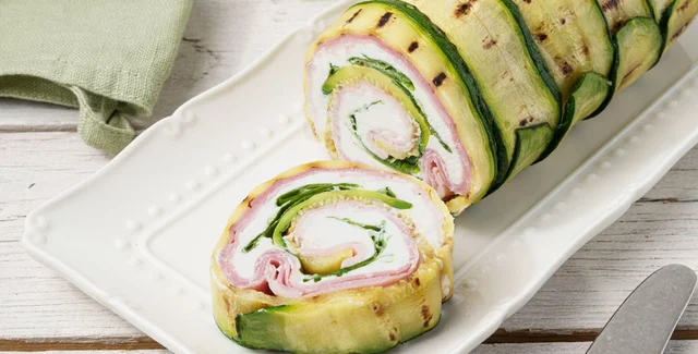 Рулет из кабачков, фаршированный свежим сливочным сыром с зеленью и ломтиками ветчины, — это очень простой рецепт. И это блюдо отлично подойдет в качестве закуски или второго блюда.