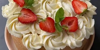 Ножом пройтись по краю формы, достать корж, украсить верх кремом и ягодами.