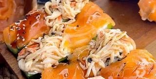 Огурец разрезать вдоль пополам, убрать сердцевину, сделав "лодочку". Заполнить ее рисом, смазать сверху сыром, выложить на него крабовые палочки и рыбу. Получается очень вкусно, а необычный внешний вид блюда удивит ваших гостей.
