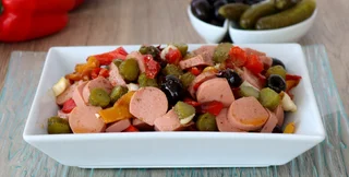 Перец вымойте, очистите от плодоножек и семян, нарежьте соломкой и бросьте на сковороду с солью и маслом, пока он не станет мягким. Тем временем нарезаем ломтиками сосиски и корнишоны. (Если хотите, вы можете ненадолго поджарить сосиски на гриле, прежде чем разрезать их.) Положите оливки без косточек, зеленый лук, перец, сосиски и корнишоны в миску, приправьте по вкусу солью, перцем, маслом и орегано и перемешайте. Вот и все, венский салат готов.