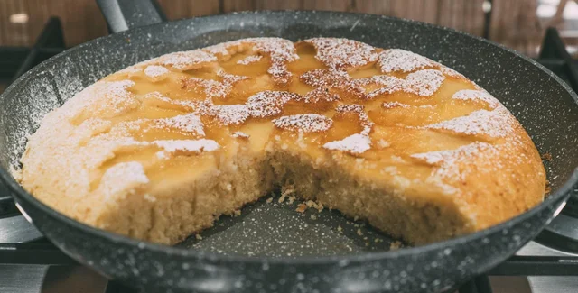 Накройте крышкой и готовьте на среднем огне около 25 минут или пока верхняя часть пирога не застынет. Переверните его с помощью крышки и продолжайте готовить еще 5–10 минут. Готовность проверяйте, как в классическом тесте, на зубочистку.