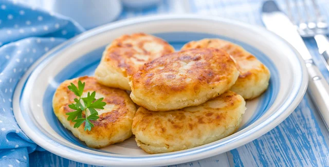 Сформируйте из картофельной массы оладьи, поместив внутрь мясную начинку.