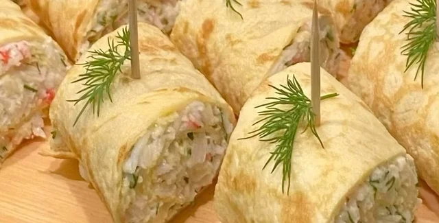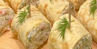Крабовые палочки и сыр натереть на терке, чеснок пропустить через пресс. Все ингредиенты начинки смешать, посолить по вкусу, и равномерным слоем смазать каждый блин. Свернуть в рулет и порезать на маленькие рулетики. Подавать на стол, проткнув посередине шпажками или зубочистками, чтобы рулетики не разворачивались.