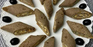 На каждый печеночный блин выложить начинку и завернуть в рулет. Рулет нарезать на порционные кусочки.