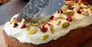 Все ингредиенты для крема смешать, смазать кремом кекс, посыпать его сверху тыквенными семенами и клюквой.