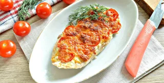 Как только мясо обжарилось, следует уменьшить огонь, выложить на мясо помидор и сверху распределить соус. Накрыть его крышкой и готовить еще приблизительно пять минут.