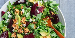 Шаг 3. Положите руколу в большую сервировочную тарелку и слегка заправьте соусом. Сверху выложите свеклу, авокадо, козий сыр и грецкие орехи. Аккуратно перемешайте и при необходимости добавьте еще немного соуса.