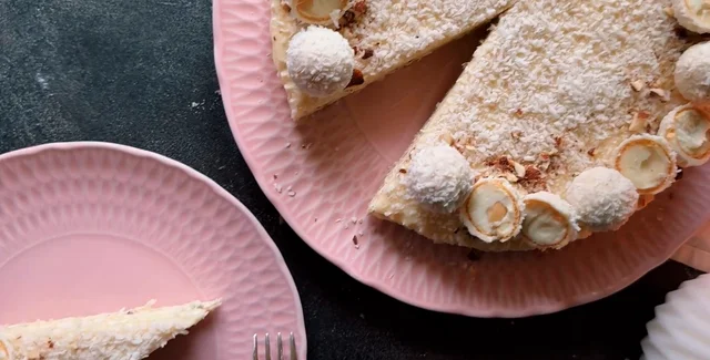 Обычно рецепты вафельных тортов известные шеф-повара не публикуют, ведь готовится такой тортик очень просто. Готовые вафельные коржи можно купить в любом супермаркете, а крем обычно готовят из вареного сгущенного молока. Но это вкусный торт приготовлен в стиле конфет "Рафаэлло".