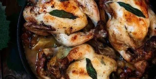 Поставить сотейник в предварительно разогретую до 190 градусов духовку и готовить 20 минут. Через 20 минут перевернуть цыплят, положить на грудку по листу шалфея и запекать еще 20 минут.