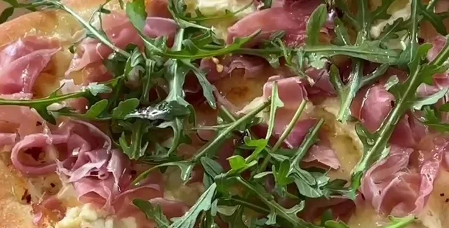 На подрумяненное основание выложить прошутто, рукколу, полить теплым медовым соусом и можно подавать к столу.