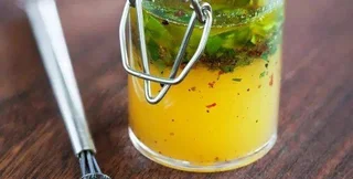 Такую заправку можно использовать для салата из микса салатных листьев, зелени и апельсиновых долек. Он получается освежающим и легким и идеально подходит к мясным и рыбным блюдам.