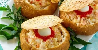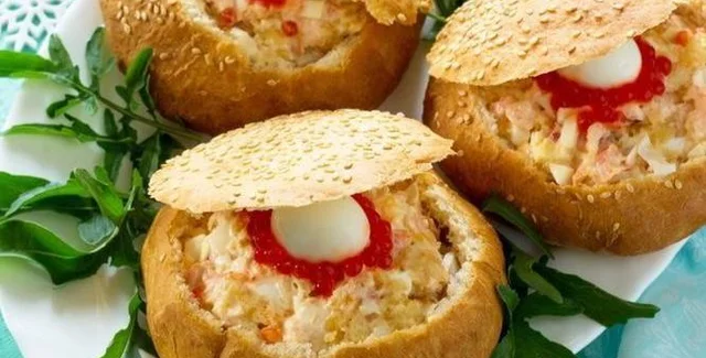 Из булочек вынуть сердцевину. Начинить их салатом и сверху накрыть крышками от булочек. Оставить на час, чтобы булочки пропитались салатом.