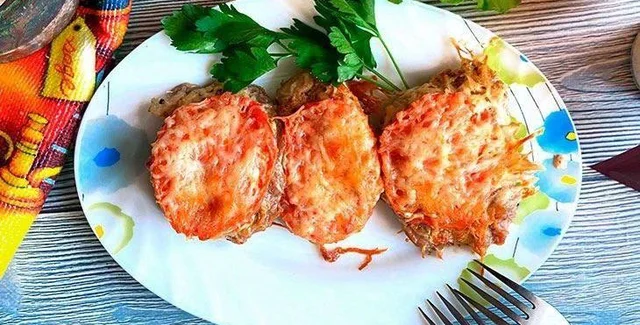 Помидоры порезать кружочками и выложить поверх стейков. Сверху посыпать их тертым твердым сырпом.