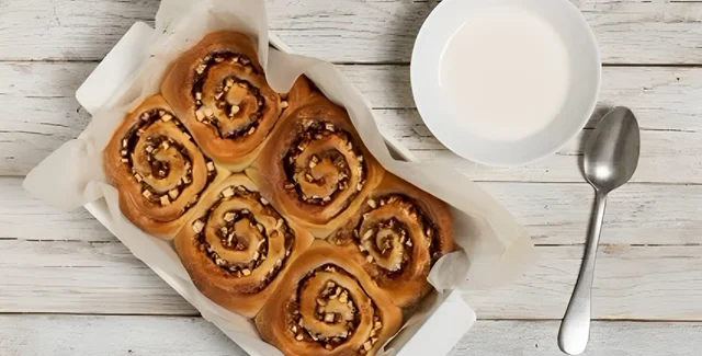 Когда тесто поднимется, обмять его и раскатать его в форме прямоугольника. Выложить начинку, оставляя 1 см пустым с одного края. Свернуть в рулет и нарезать кружочками