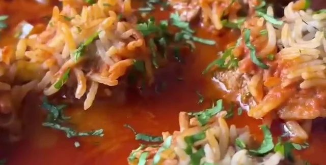 Пока готовится соус, сформировать 7-8 тефтелей, обвалять их в рисе и выложить в соус. Посуду накрыть крышкой и тушить на среднем огне 35-40 минут, не мешая, и не переворачивая.