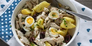 Благодаря белому, мягкому мясу и нежному вкусу курица может сочетаться со многими другими ингредиентами и поэтому является отличной основой для создания множества различных салатов. Она идеально сочетается с яйцами и картофелем, как в этом рецепте, а также с перцем и каперсами. К курице можно добавлять салат и сельдерей, а также лук и оливки.