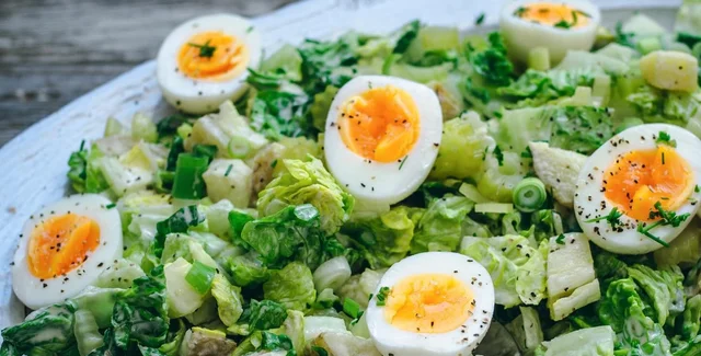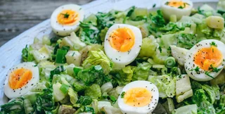 В большой миске смешайте вареный картофель в мундире и салат, затем полейте сверху заправкой и перемешайте. Выложите картофельный салат с салатом на сервировочный поднос. Сверху положите зеленый лук, маринованный сельдерей, яйца всмятку и украсьте зеленым луком или укропом. Подавайте немедленно.