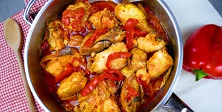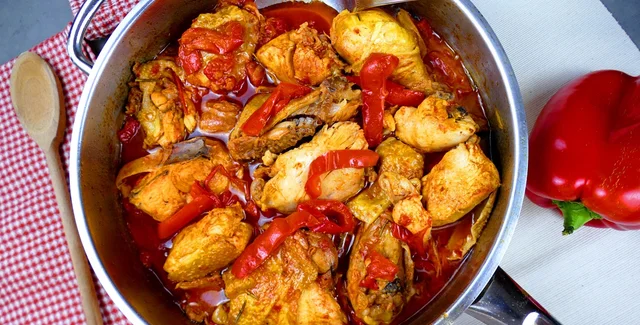 Куриное филе нарежьте на небольшие кусочки и обжарьте в той же сковороде до готовности, около 10 минут. В конце добавьте томатную пасту и перемешайте. Переложите в форму для выпекания на лук с перцем.