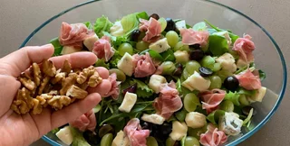 Соберите виноградный салат, выбрав большую низкую миску, или форму для запекания. Положите салат, потом виноград, потом кубики сыра, хамон. Наконец, добавьте очищенные грецкие орехи, нарезанные по своему вкусу.