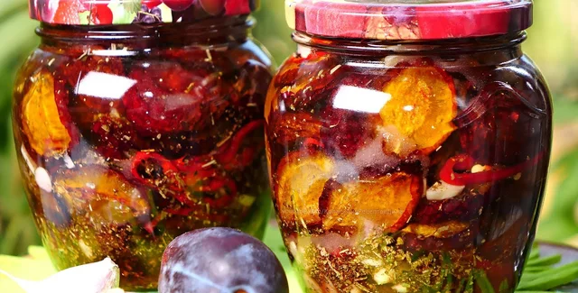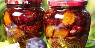 Баклажаны нарезаем кольцами по 1 см. Солим, добавляем травы. Отправляем в разогретую до 60 градусов духовку на 4-6 часов. Сливы разрезаем, удаляем косточку и тоже вялим по тому же принципу. Перец разрезаем на ломтики и также вялим в духовке.
