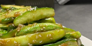 К огурцам добавить крахмал, хорошо перемешать и добавить в сковороду с чесноком. Жарить 2 минуты. Влить в огурцы соевый соус, добавляем молотый красный острый перец и кунжут. Жарить еще 5–7 минут, периодически перемешивая.