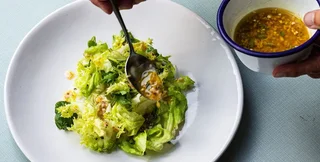 Хорошо залейте салат теплой водой и слейте. Повторите процесс в более прохладной воде, а затем в ледяной. Заверните листья салата в чистую ткань или кухонную бумагу и дайте им полностью высохнуть.
