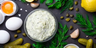 15. Сметана, оливковое масло, чеснок, горчица, тертый соленый огурец, зеленый лук и сок лимона.