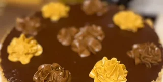 Шоколад растопить, добавить масло, перемешать. Покрыть торт сверху шоколадом, бока посыпать крошкой. Украсить торт кремом, как показано на видео.