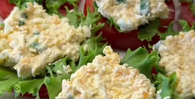Помидоры нарезать дольками и выложить на них листья салата, а сверху — намазку. По желанию закуску можно посыпать кунжутом. Выложить ее на блюдо и подавать на стол.