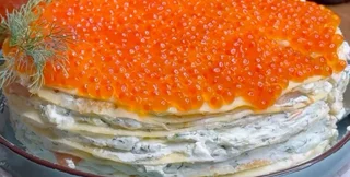 Эффектная закуска на праздник: рецепт блинного торта с красной рыбой и икрой