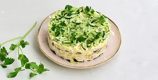 Салат уберите в холодильник на несколько часов, чтобы он настоялся. Достаньте. Выложите сверху огурец, украсьте рубленной зеленью и подавайте на стол.
