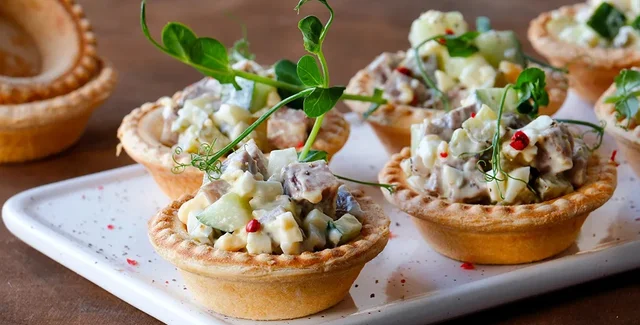 Праздничные тарталетки — это отличное решение для стола на Новый год. Мини-закуски добавляют шарма сервировке и выглядят нарядно. В небольшие корзиночки можно разложить привычные новогодние салаты. Например, вкусный салат из печени трески. Фокус собрал топ-3 лучших салатов для тарталеток.