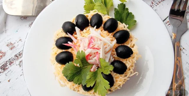 Слоеный салат с крабовыми палочками и черносливом | Фото: 1000.menu