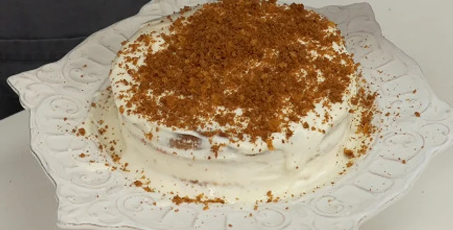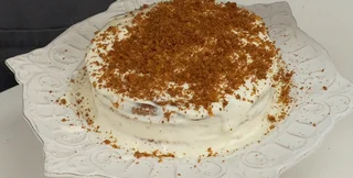 Перед подачей смажьте торт по бокам оставленным заранее кремом и покройте их бисквитной крошкой.