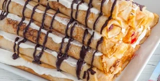 На рабочий стол выложите один блинчик. Распределите по нему немного остывшей шоколадно-сливочной массы и крема. Сверните трубочкой. Таким образом подготовьте все остальные блинчики для торта. У вас останется примерно треть крема.