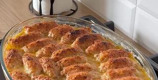 На дно формы для запекания вылить несколько ложек заливки, выложить "голубцы", залить оставшимся соусом и запекать в предварительно разогретой до 200 градусов духовке до готовности.