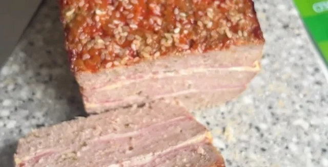 Форму для запекания выложить пергаментом. На дно выложить первую часть мяса, дальше – сыр, сверху – ветчину, затем повторить в той же последовательности (фарш-сыр-ветчина). Сверху выложить оставшееся мясо, смазать кетчупом и посыпать кунжутом.
