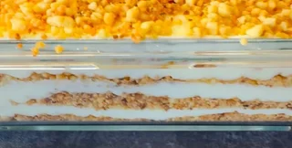 4 ст. л. крошки отложить для посыпки. Остальную крошку разделить на 4 части. В форму выложить слой крошки, затем слой горячего крема. Повторить слои. Количество слоев зависит от размера вашей формы.