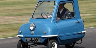 Одноместный трехколесный автомобиль Peel P50 длиной 1,43 метра выпускался с 1962 года. Он оснащался мотором мощностью 4,2 лошадиные силы и трехскоростной КПП, у которой отсутствовала задняя передача.
