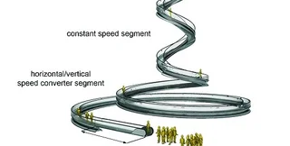 Любопытно, что источником вдохновения послужило устройство, созданное на заре эпохи автоматических подъемников, - винтообразная самодвижущаяся дорожка, на некоторое время установленная на одной из станций лондонского метро в 1906 году. Кроме того, Давид внимательно изучал обычные монорельсовые дороги, "американские горки" и чертежи известного изобретателя Гилберта Луны 1970-х годов.