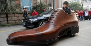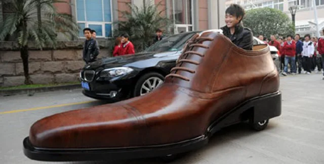 Китайская обувная компания Kang Shoe построила электрокар в виде ботинка. Премьера автомобиля состоялась возле главного офиса фирмы в городе Вэньчжоу (провинция Чжэцзян)