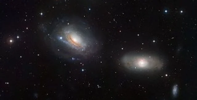 Фото с подробным описанием доступно на сайте обсерватории, сообщает Лента.ру. На снимке изображены галактики NGC 3169 и NGC 3166. Они располагаются на расстоянии 70 миллионов световых лет от Земли в созвездии Секстант и на расстоянии 50 тысяч световых лет друг от друга - на таком расстоянии они уже оказывают гравитационное воздействие друг на друга. В частности, на снимке хорошо видны искажения, которые в структуру скоплений вносит подобное взаимодействие.